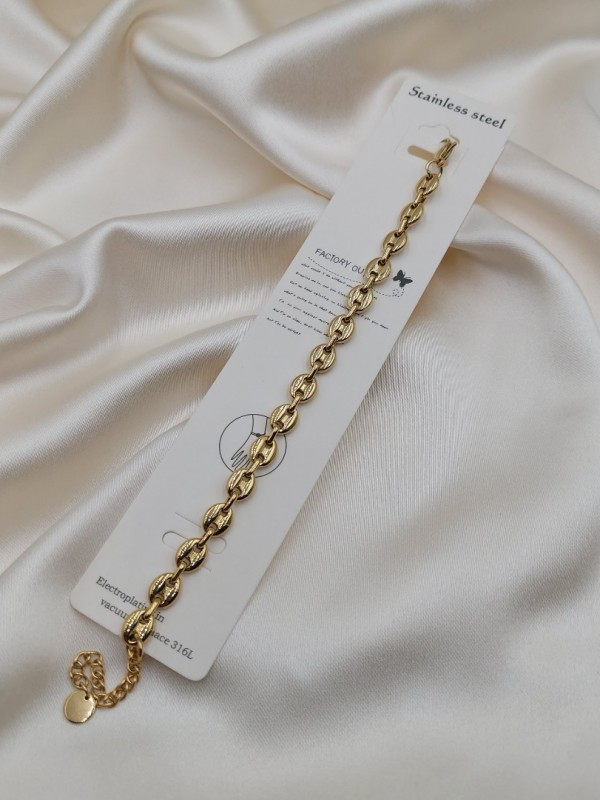 "Bakla Model Silver 316L Çelik Bileklik, zarafeti ve dayanıklılığı bir arada sunar. 316L paslanmaz çelikten üretilen bu bileklik, altın kaplama ile göz alıcı bir görünüme sahiptir. Modern tasarımıyla her tarz ve her ortama uyum sağlar. Hem günlük kullanım hem de özel günler için ideal bir seçimdir."