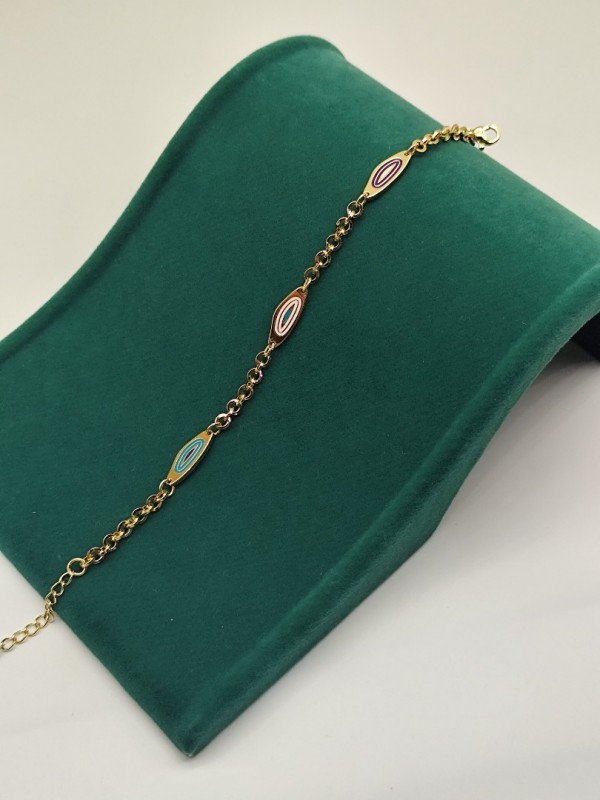 Oval formda nazar motifleriyle tasarlanan bu VIP bileklik, negatif enerjilere karşı koruyucu sembolizm taşır. Altın kaplama zinciri ve renkli detaylarıyla hem anlamlı hem de estetik bir aksesuar arayanlar için idealdir.